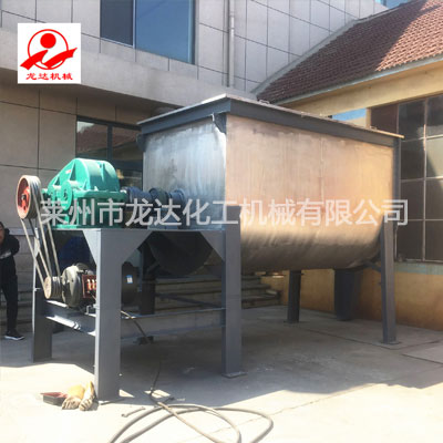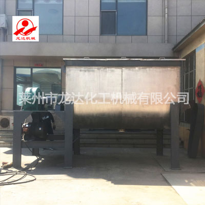 臥式混合機由U形容器、螺帶攪拌葉片和傳動部件組成;U形的長體筒體結構,保證了被混合物料(粉體、半流體)在筒體內的小阻力運動。正反旋轉螺條安裝于同一水平軸上,形成一個低動力的混合環境,螺帶狀葉片一般做成雙層或三層,外層螺旋將物料從兩側向中央匯集,內層螺旋將物料從中央向兩側輸送,可使物料在流動中形成更多的渦流,加快了混合速度,提高混合均勻度;采用皮帶輪帶動擺線減速機驅動,相對于齒輪減速機的大扭矩,皮帶傳動的彈性連接有在超載時保護傳動部件的優勢。其功能是將各種成份的粉料、液體混合均勻,具有適用性廣、混合均勻度好、物料殘留少、維護保養方便等特點,是粉狀物料混合加工的理想設備。